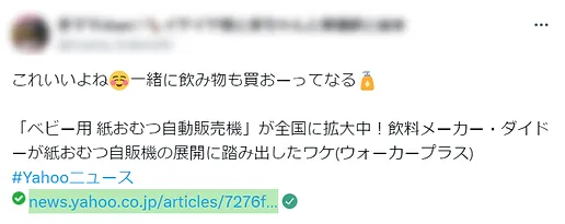 X(旧Twitter)上でも「どんどん広がってほしい」「一緒に飲み物も買えるのが便利」「子どもの急なトイレでも安心」など、この取り組みを歓迎する声が次々に上がっていました。これまで乳幼児連れの外出は、荷物がかさばってしまったり、急なおむつの替えが用意できない点が根本的な悩みでしたが、そこに応えた点がSNSで高く評価されました。